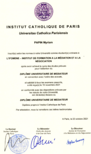 Ce mémoire, complété par l’évaluation écrite et orale que j’ai passée au sein de l’IFOMENE, m’a permis d’obtenir mon diplôme universitaire de Médiateur.